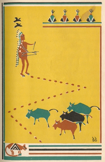 weak. The sun beat upon his head and made him dizzy, but he walked mile after mile without stopping. Finally, after two days, Two Hawks came in sight of a deep canyon near the mountain. Tired and thirsty, the chief looked over the edge of the canyon. There, feeding on the grass that grew near the edge of a little stream at the bottom, was a herd of buffalo. Two Hawks' heart leaped with joy when he saw the animals. Although he was weak from hunger the Indian began creeping down the side of the canyon through the bushes. When he was close enough to the buffaloes he put an arrow to his bow, but he was so weak that he could hardly bend the bow. Finally he let the arrow fly. His aim was good, and one of the