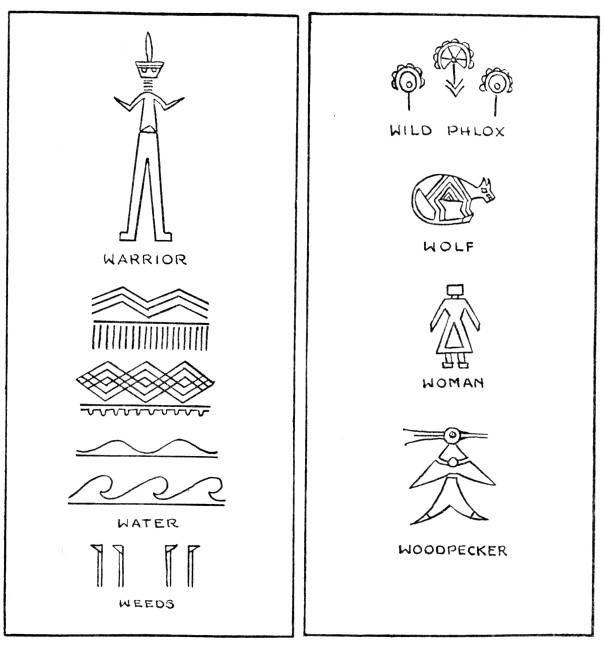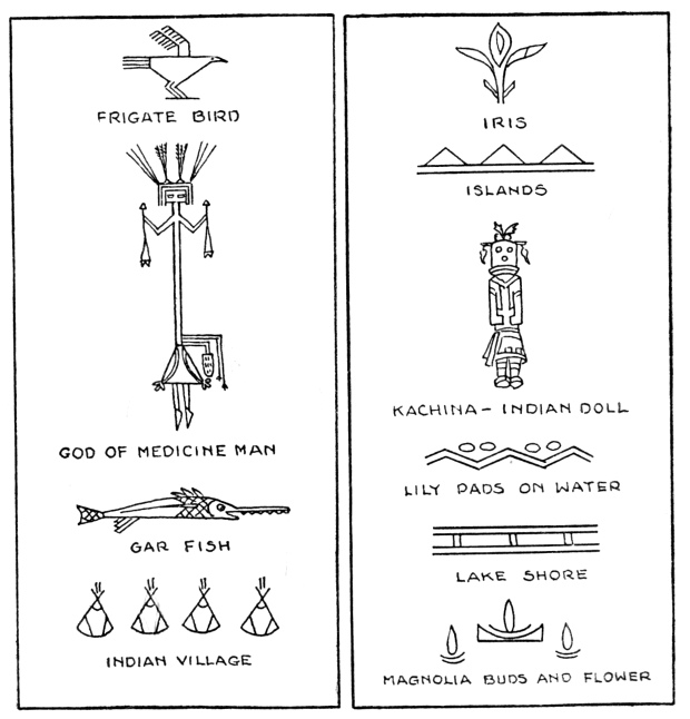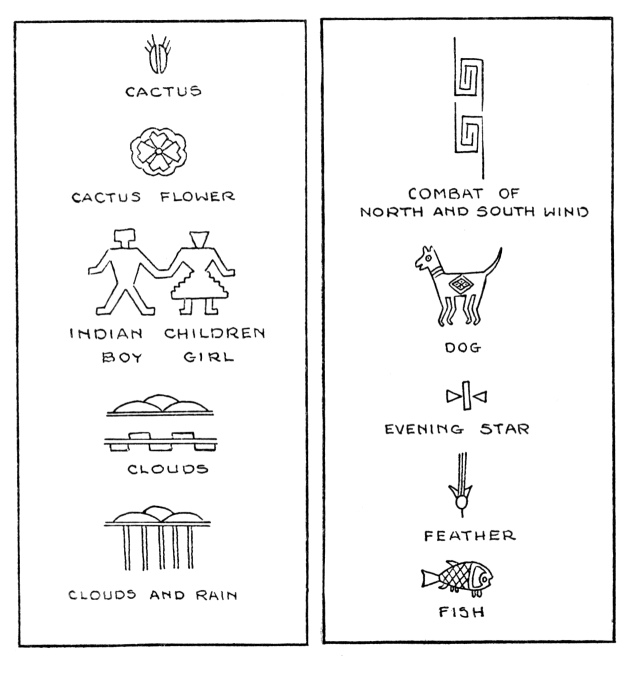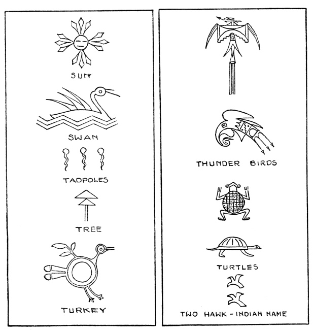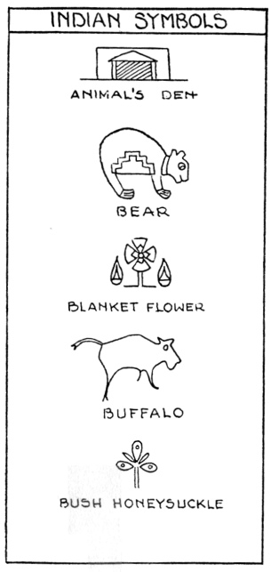 The Indians used signs or symbols to represent words. There were many of these signs; only a few are shown on the following pages. These are the symbols that the artist used in making the colored pictures.