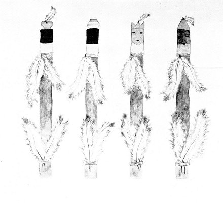 FIGURE 1. Katsina prayer sticks. Made of willow (a "water" tree); the bark is left on and the lower part (brown) represents legs; measured from base of palm to tip of middle finger (about 7 inches); turkey feathers (white), on top eagle down; the faces are painted in the colors of the directions (from left to right--1st, dark green; 2nd, red; 3d, yellow; 4th, light green); section below faces