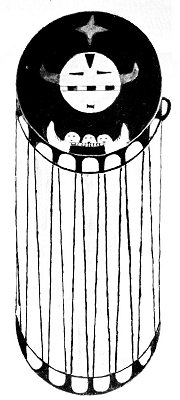 FIGURE 1. Drum. Sides are yellow with vertical blue lines; band at base, blue with white scallops; top blue; katsina symbol in center of top, yellow with green and white band and hornlike projections of red; boatlike object lower edge