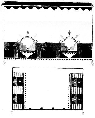 FIGURE 2. Katsina costume. a, Mantle of impersonator of female katsina, Made of cotton; the design is embroidered on one side with colored yarns; top, black and green in 4-day period; white line is a trail; serrations top and bottom represent waves of water; white body represents the earth. Unfinished (no eyes) katsina masks; the diamond (red, yellow) represents feathers on the mask, the terraces (red, yellow) on the mask face represent fields; the median line on the face represents the 4-day-and-night period. b, Kilt worn by impersonator of male katsina: Designs are fields (red, blue) with part of katsina face. Straight lines (red) for rain, water; bottom line (black) for the 4-night period.