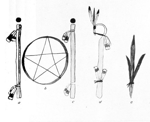 FIGURE 1. Prayer sticks used by Kopishtaiya, also Antelope clan staff. a, Trail (hiamuni) prayer stick (gray and blue). It opens the trail; it is laid so that the head faces the pueblo. The Kopishtaiya use it in entering the pueblo. b, Shield (haiitsi) of Kopishtaiya, a hoop (brown) with cotton string (black) fastened like a star. c, Staff (yapi) (pink) the Antelope clan use in the drama of the katsina war, willow (see p. 72). d, Used as a cane (gray) by Tsiukiri, Kopishtaiya chief. Turkey feathers at tip of crook (white), eagle and parrot feathers. e, This hiatsimuh prayer stick (brown, feathers red) laid by the Kopishtaiya against corners of houses and cliffs to keep them from falling. Hard wood. Four of these are used at a time. The paint iakatcha (manly paint) they get from Hopi. Faces above a and c green.