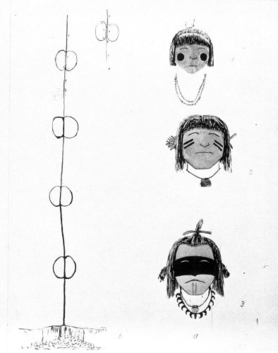 FIGURE 2. a, Face paintings of the dead. 1, Woman (face yellow, red spots on either cheek, necklace coral). 2. Man (face brown). 3, Chaianyi (forehead tan, mask black, lower part of face grey; clan necklace black and abalone pendant gray). b, Groove in rock for rite of forgetting the dead.