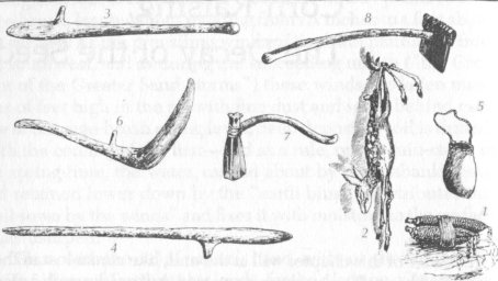 At the end of the fourth day after the first planting the householder quite likely makes a new planting-stick (fig. 4.4), laying the old one aside. He also gets out his seed bags. These (see fig. 4.5) are curious; usually of rawhide, they have been so puckered and sewed that they form egg-shaped receptacles, cut off at the smaller end. They are ingeniously made to remain open and otherwise retain their shape by being moistened, filled first with damp, then with moderately hot, dry sand, and hung up to harden by desiccation, which of course takes place in a short time. A little hoop of wood is, moreover, fitted around the upper edge, much as is the large wire rim of a tin bucket, and like the latter, the seed-pouch is also furnished with a bail--of twisted buckskin.