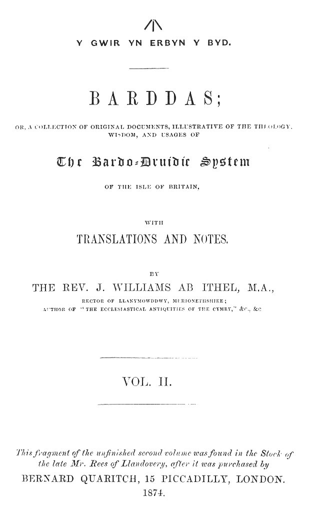 The Barddas of Iolo Morganwg, Vol. II., ed. by J. Williams Ab Ithel, [1874], at sacred-texts.com