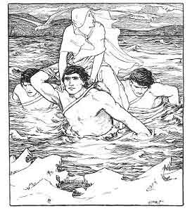 "I will try another plan on them," said the druid; and he placed before them a grey sea instead of a green plain. The three heroes stripped and tied their clothes behind their heads, and Naois placed Deirdre on the top of his shoulder.