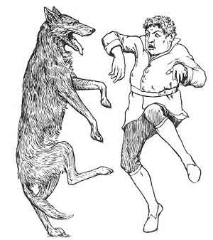 He said no more, but spit in his fist, and gave a flourish of his club. It was all the poor divel of a wolf wanted: he put his tail between his legs, and took to his pumps without looking at man or mortal, and neither sun, moon, or stars ever saw him in sight of Dublin again.