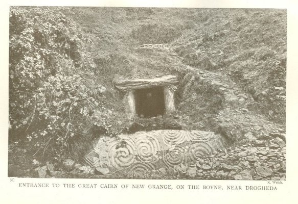 The most famous of such fairy hills are about five miles from Drogheda. 3 They are still connected with the names of the Tuatha Dé Danann, though they are now not called their dwelling-places, but their tombs. On the northern bank of the Boyne stand seventeen barrows, three of which--Knowth, Dowth, and New Grange--are of great size. The last named, largest, and best preserved, is over 300 feet in diameter, and 70 feet high, while its top makes a platform 120 feet across. It has been explored, and Roman coins, gold torques, copper pins, and iron rings and knives have been found in it; but what else it may have once contained will never be known, for, like Knowth and Dowth, it was thoroughly ransacked by Danish spoilers in the ninth century. It is entered by a square doorway, the rims of which are elaborately ornamented with a kind of spiral pattern. This entrance leads to a stone passage, more than 60 feet long, which gradually widens and rises, until it opens into a chamber with a conical dome 20 feet high. On each side of this central chamber is a recess, with a shallow oval