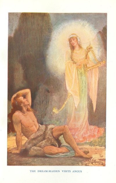 Why Lêr and Mider should have so taken the matter to heart is difficult to understand, unless it was because they were both among the oldest of the gods. The indifference of Angus is easier to explain. He was the Gaelic Eros, and was busy living up to his character. At this time, the object of his love was a maiden who had visited him one night in a dream, only to vanish when he put out his arms to embrace her. All the next day, we are told, Angus took no food. Upon the following night, the unsubstantial lady again appeared, and played and