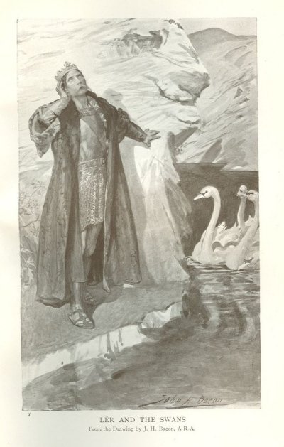 But Lêr was not satisfied that she spoke the truth, and went in haste to the lake, to see if he could find traces of them. He saw four swans close to the shore, and heard them talking to one another with human voices. As he approached, they came out of the water to meet him. They told him what Aeife had done, and begged him to change them back into their own shapes. But Lêr's magic was not so powerful as his wife's, and he could not.