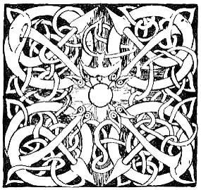 With hoarse cries the Fomorians fell on the De Danaans, but Nuada and his folk held together and withstood them as well as they were able. Scarcely had the weapons clashed when a light appeared in the horizon and a sound of mighty battle trumpets shook the air. The light was so white that no one could look at it, and great rose-red streamers shot from it into the sky.