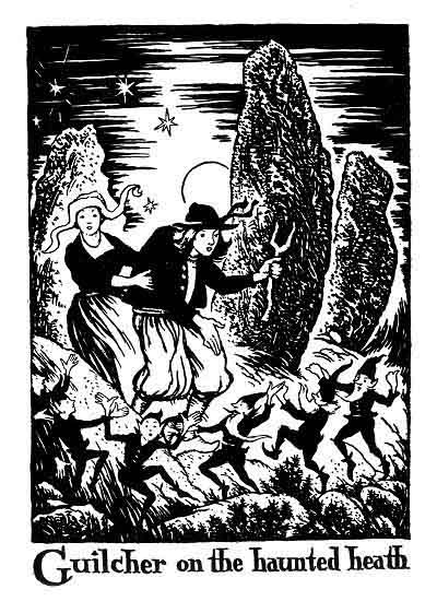 However, there was a man who braved the moorland. His name was Guilcher. One evening he was coming home with his wife from a field, weary after ploughing, when he decided to take a short-cut across the haunted heath. As it was early he hoped that the elves had not begun their dance. But when Guilcher and his wife were in the middle of that waste land he saw the elves scattered among the huge stones, like sparrows in a corn field. He was about to turn back when he heard the horns of the wood elves echoing behind him. Guilcher's legs began to shake.