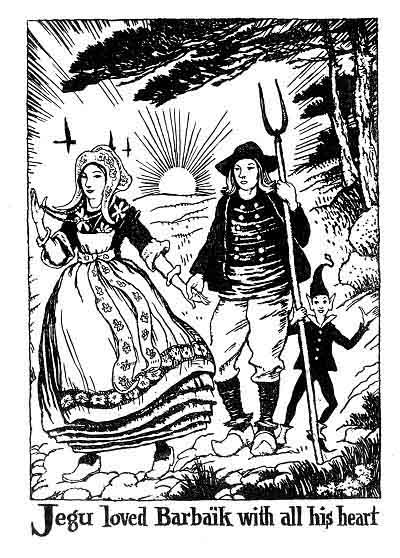 Among Barbaïk's suitors there was one who loved her more than all the others. He was her father's farm hand, Jegu, a steadfast and upright Christian. But, alas, he was as rough as a Northerner and as ugly as a tailor. Barbaïk would not listen to him in spite of all his merits. She always laughed and spoke of him as "the country bumpkin."