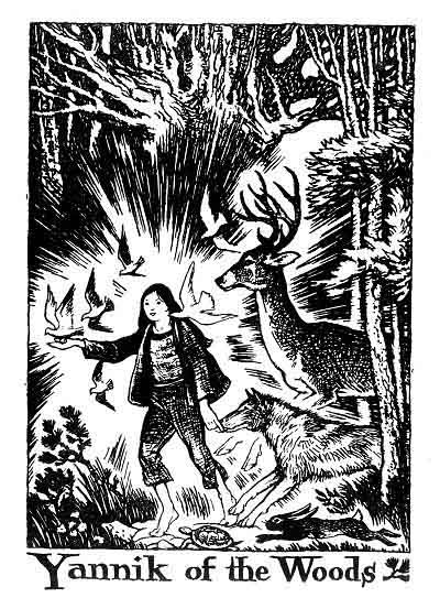 Yannik was like one of these, a presence, a light, a smile. Everyone welcomed him, but there was none who could keep him inside cottage walls. Though she had softly cradled him at nightfall, at dawn when the farmer's wife arose she saw by the ruddy firelight that Yannik's bed was empty. No one had heard him go, but on the fallen snow footsteps could be traced leading to the forest where Yannik lived with the birds and the beasts he loved.