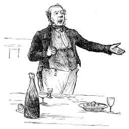 I think the pink ribbon was, at least to a Cockney, the pleasantest sight of all: for on the evening after the show we saw many carts going away so adorned, having carried off prizes on the occasion. First came a great bull stepping along, he and his driver having each a bit of pink on their head; then a cart full of sheep; then a car of good-natured-looking people, having a churn in the midst of them that sported a pink favour. When all the prizes were distributed, a select company sat down to dinner at Macavoy's Hotel; and no doubt a reporter who was present has given in the county paper an account of all the good things eaten and said. At our end of the table we had saddle-of-mutton, and I remarked a boiled leg of the same delicacy, with turnips, at the opposite extremity. Before the vice I observed a large piece of roast-beet which I could not observe at the end of dinner, because it was all swallowed. After the mutton we had cheese, and were just beginning to think that we had dined very sufficiently, when a squadron of apple-pies came smoking in, and convinced us that, in such a glorious cause, Britons are never at fault. We ate up the apple-pies, and then the punch was called for by those who preferred that beverage to wine, and the speeches began.