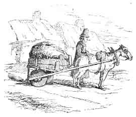 A picturesque sort of vehicle is said to be going much out of fashion in the country, the solid wheels giving place to those common to the rest of Europe. A fine and edifying conversation took place between the designer and the owner one of these. "Stand still for a minute, you and the car, and I will give you twopence!" "What do you want to do with it?" says the latter. "To draw it says he, with a wild look of surprise. "And is it you'll draw it?" "I mean I want to take a picture of it: you know what a picture is!" "No, I don't." "Here's one," says I, showing him a book. "Oh, faith, sir," says the carman, drawing back rather alarmed, "I'm no scholar!" And he concluded by saying, "Will you buy the turf or will you not?" By which straightforward question he showed himself to be a real practical man of sense; and, as he got an unsatisfactory reply to this query, he forthwith gave a lash to his pony and declined to wait a minute longer. As for the twopence, he certainly accepted that handsome sum, and put it into his pocket but with an air of extreme wonder at the transaction, and of contempt for the giver; which very likely was perfectly justifiable. I have seen men despised in genteel companies with not half so good a cause.