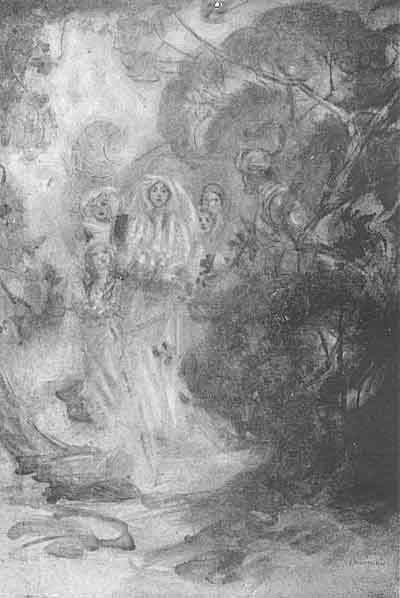 The priest was waiting in the church, the bridegroom arrived, but the bride did not come. Where had she gone? She had stepped on board a barque with the dark steel-clad lord, and the ship passed silently over the waters until it vanished among the shadows of night. Then the lady turned to her husband.