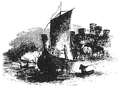 And they went along the mouths of the rivers, until they came to the mighty river which they saw flowing to the sea, and the vast city, and the many-coloured high towers in the castle. They saw the largest fleet in the world, in the harbour of the river, and one ship that was larger than any of the others. "Behold again," said they, "the dream that our master saw." And in the great ship they crossed the sea, and came to the Island of Britain. And they traversed the island until they came to Snowdon. "Behold," said they, "the rugged land that our master saw." And they went forward