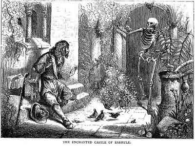 The poor pedlar at once discovered he was on enchanted ground. The figure at the door beckoned with its fearful bony hand, and silently invited him to enter. Phil felt that if he did not instantly make his escape he would be lost for ever. He jumped up from his seat in a great hurry, and in doing so upset everything that was upon his lap--bread, meat, and with them the remains of the little pinch of SALT. No sooner did the salt touch the ground than the ghastly figure gave an unearthly yell and fell, with a noise like rattling hail, a heap of bones. The mighty fabric of the castle, after rocking and tottering to and fro, fell to the ground with a