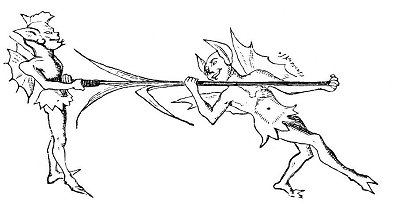 The moment the last spark died out they gave a loud unearthly yell, which awoke the sleeping watchman, who was frightened out of his wits at seeing himself surrounded by such a number of horrid-looking little bugganes, dancing, leaping, shouting, and turning somersaults, that would have made a modern acrobat or music-hall gymnast give up his profession in despair of ever being able to equal. He looked all round for a way to escape, but before the poor fellow could gain the door and rush out of the building, they all together lifted the roof off the church and dashed it to the ground in ten thousand pieces, burying the unlucky watchman in the ruins.