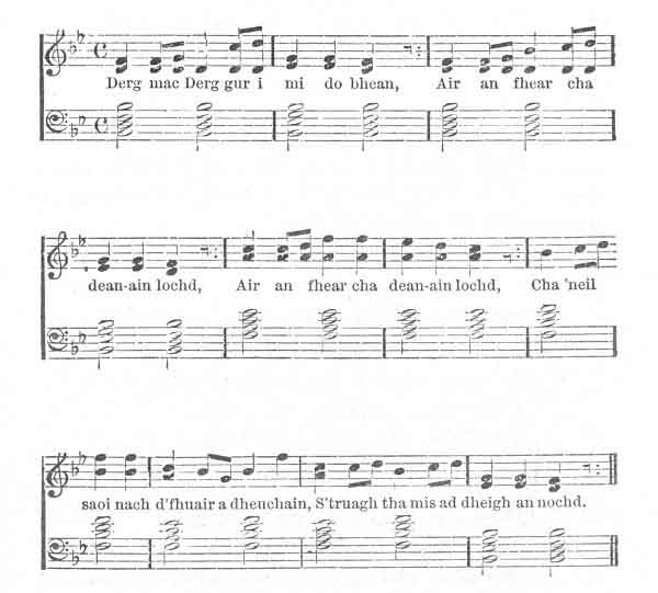 "The subject of the song is Diarmaid O Duine, or Dearg as he was sometimes called. Diarmid was, as I daresay you know, the progenitor of the clan Campbell, who are called at times Siol Diarmid, at other times Clann Duine. I never heard who his wife was, but she was esteemed a virtuous and worthy person; yet she had enemies, who wished to persuade her husband that she did not love him, and who concerted a plot to prove her fidelity. Diarmid was a great sportsman, as all Fingalians were, and hunted wild boars, which, it would appear, were numerous in the Scottish forests at that period. The sport at times proved fatal to those engaged in it. Pretended friends persuaded Diarmid to pretend that he was killed by one of those animals. They put him on a bier, and carried him home to his wife, all bloody, as if he had really suffered as they said. She conducted herself with becoming fortitude and composure, ordered refreshments