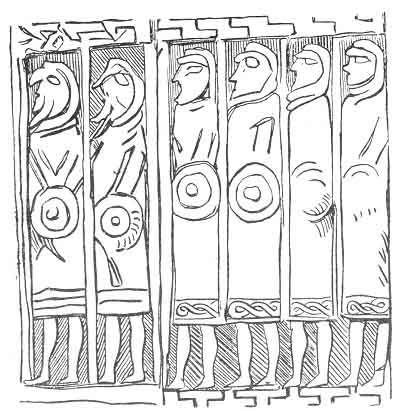 They stood, Conall, the young King of Lochlann, and Garna Sgiathlais, opposite to the house of Mac-a Moir, and they clashed their shields for battle. Mac-a-Moir
