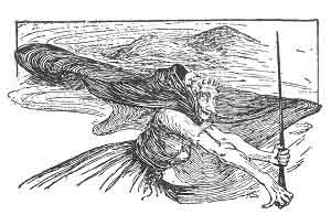 of the Black Mountains; and, looking in that direction, the three brothers saw her, sure enough, coursing over the waste in a direct line with her home, waving her magic staff. As she strode past the pools, the water splashed upwards in brown foam before her; as she clambered over the peat-hags, the divots and turves flew away on every side; as she swept along the dry paths, the dust in clouds whirled behind her like an attendant spirit.