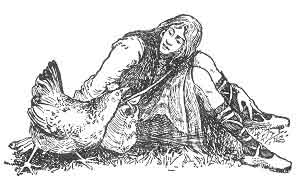 In the meantime Dougald, the second brother, had gone to seek for treasure on the south side of the bothy. Here at first he sought most carefully, but could discover nothing of even the smallest value, and, like Donald, getting tired of seeking, he was almost giving up the hunt in despair, when he heard, or thought he heard, a strange, weird chuckle, like laughter, proceed from behind a heap of rank grass in the shade of the wall. Examining more closely, he discovered the cause of the noise in a queer-looking gray hen, seated amongst the rubbish. She had a bright red comb and a yellow beak, and from her eyes came such a strange look, unusual in an ordinary fowl, as she fixed them upon the stranger, that Dougald at once understood the bird was something decidedly out of the common.