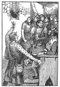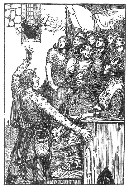 Now the fatal day arrived when Ian na Piob was to suffer for his evil deception of the chief, and the gaoler came, and led him into the hall of the castle, where all were assembled, and the chief and his wife sat in state to see the sentence carried out.