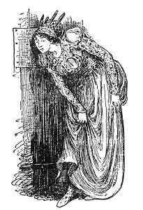 So the chief's lady thought it could do no harm to any one, and besides, the chief need not know anything about it; moreover, she was like every other woman, as inquisitive as an ape, and could not deny her curiosity. Thus it was that at midnight she bribed the gaoler, and repaired to the dungeon where Ian na Piob was confined. There, giving. three raps upon the oaken beams, she applied her ear to the keyhole of the great door.