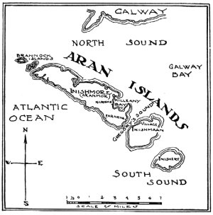 The geography of the Aran Islands is very simple, yet it may need a word to itself. There are three islands: Aranmor, the north island, about nine miles long; Inishmaan, the middle island, about three miles and a half across, and nearly round in form; and the south island, Inishere--in Irish, east island,--like the middle island but slightly smaller. They lie about thirty miles from Galway, up the centre of the bay, but they are not far from the cliffs of County Clare, on the south, or the corner of Connemara on the north.
