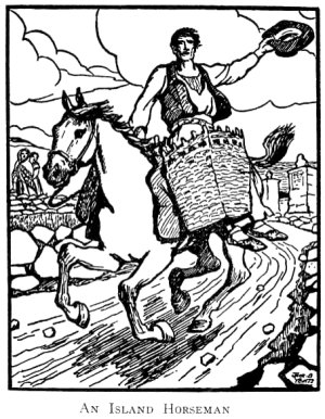 When the horses were coming ashore a curagh that was far out after lobster-pots came hurrying in, and a man out of her ran up the sandhills to meet a little girl who was coming down with a bundle of Sunday clothes. He changed them on the sand and then went out to the hooker, and went off to Connemara to bring back his horses.