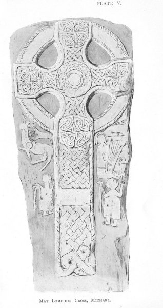 A very beautiful cross at the Church gates, Michael (pl. V.), erected by Mal-Lomchon to Malworrey, his foster-mother, daughter of Dugald and wife of Athisl, bears the figure of a Harper seated, and approached by a long-robed figure offering a drinking horn. Significance lies in the fact that the harp was unknown among the Norsemen until their intercourse with the Irish. There is, however, a lost story of Viking age concerning a Harper, known only by one or two references, as, for example, in Voluspa--"There Eggtheow the gladsome, the Giantesses Harper, sat on a mound tuning his Harp!" By that time, therefore, not only was the instrument known to the Scandinavians, but they themselves became players, "Eggtheow the Glad-some"--what a charm lies in the epithet--being a Scandinavian name. And, if they enjoyed the harp at their earthly feasts we may be sure they would expect their heroes to be entertained by it in Valhall.