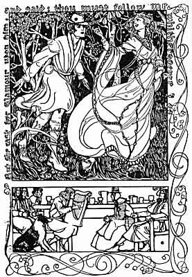 So he went, and the goblin (for the Lady of the Greenwood was none other) went with him. When he saw Angharad his wife, she appeared an old hag, but he retained the recollection of days past and still felt true love for her, but he was not able to loose himself from the bond of his enchantment. "It is necessary for me," said he, "to part from thee for a time, I know not how long." They wept together and. broke a gold ring between them: he kept one half and Angharad the other. They took their leave of each other, and he went with the Lady of the Greenwood and knew not whither: for a powerful spell was upon him, and he saw not any place or person or object under its true and proper appearance, excepting the half of the ring alone.