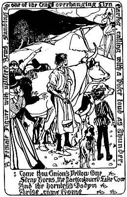 In times of old the neighbourhood of the lake was haunted by a band of elfin ladies. They were sometimes seen in the dusk of a summer evening, clad all in green, accompanied by their hounds and comely milk-white kine; but no one was favoured with more than a passing glimpse till an old farmer residing at Dyssyrnant, in the adjoining valley of Dyffryn Gwyn, had the good luck to catch one of the Gwartheg y Llyn, or kine of the lake, which had fallen in love with the cattle of his herd. From the day that he captured the elfin cow the farmer's fortune was made. Never was there such a cow, never such calves, never such milk and butter and cheese, and the fame of the Fuwch Gyfeiliorn, or the Stray Cow, spread through that central part of Wales known as Rhwng y Ddwy Afon, the Mesopotamia between the banks of the Mawddach and those of the Dovey. The farmer, who had been poor, became rich, the owner of vast flocks and herds, a very patriarch of the mountains.