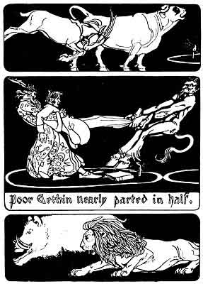 First there appeared a monstrous bull, bellowing dreadfully, but the plucky Gethin held his ground, and the bull vanished. Then a gigantic goat came and rushed full pelt at Gethin, but as he did not move the goat also melted into thin air. Next a huge bristly boar charged at him, and an immense fire-breathing lion crouched and leapt at him, but Gethin stood motionless, and as soon as these fearful apparitions crossed the circle drawn by the magician they vanished into space. Then a great fly-wheel of fire, blazing brightly and roaring loudly, made straight for poor Gethin. For a moment he lost heart and swerved out of the ring. No sooner had he done this than the fly-wheel of fire assumed the shape of the Enemy of Mankind, and began to haul Gethin away. The man with the iron hand seized hold of him and tried to get him back. Poor Gethin nearly parted in half in the struggle between the two.