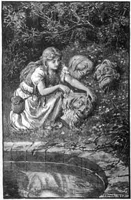 "Yes," said she, and putting forth her hand, with a silver comb performed the office, placing it upon a primrose bank. Then came up a second and a third head, saying the same as the former, which she complied with, and then pulling out her provisions, ate her dinner. Then said the heads one to another, "What shall we do for this lady who hath used us so kindly?" The first said, I will cause such addition to her beauty as shall charm the most powerful prince in the world." The second said, "I will endow her with such perfume, both in body and breath, as shall far exceed the sweetest flowers." The third said, "My gift shall be none of the least, for, as she is a king's daughter, I'll make her so fortunate that she shall become queen to the greatest prince that reigns." This done, at their request she let them down into the well again, and so proceeded on her journey. She had not travelled long before she saw a king hunting in the park with his nobles. She would have shunned him, but the king, having caught a sight of her, approached, and what with her beauty and perfumed breath, was so powerfully smitten that he was not able to subdue his passion, but proceeded at once to courtship, and after some embraces gained her love, and, bringing her to his palace, caused her to be clothed in the most magnificent manner.