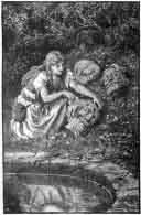 LONG before Arthur and the Knights of the Round Table, there reigned in the eastern part of England a king who kept his Court at Colchester. He was witty, strong, and valiant, by which means he subdued his enemies abroad, and planted peace among his subjects at home. Nevertheless, in the midst of all his glory, his queen died, leaving behind her an only daughter, about fifteen years of age. This lady, from her courtly carriage, beauty, and affability, was the wonder of all that knew her. But as covetousness is the root of all evil, so it happened here. The king, hearing of a lady who had likewise an only daughter, for the sake of her riches, had a mind to marry her, and though she was old, ugly, hook-nosed, and humpbacked, yet all this could not deter him from doing so. Her daughter was a yellow dowdy, full of envy and ill-nature; and, in short, was much of the same mould as her mother. This signified nothing, for in a few weeks the king, attended by the nobility and gentry, brought his deformed bride to his palace, where the marriage rites were performed. They had not been long in the court before they set the king against his own beautiful daughter, which was done by false reports and accusations. The young princess, having lost her father's love, grew weary of the court, and one day, meeting with her father in the garden, she desired him, with tears in her eyes, to give her a small subsistence, and she would go and seek her fortune; to which the king consented, and ordered her mother-in-law to make up a small sum according to her discretion. She went to the queen, who gave her a canvas bag of brown bread and hard cheese, with a bottle of beer; though this was but a very pitiful dowry for a king's daughter. She took it, returned thanks, and proceeded on her journey, passing through groves, woods, and valleys, till at length she saw an old man sitting on a stone at the mouth of a cave, who said, "Good morrow, fair maiden, whither away so fast?" "Aged father," says she, "I am going to seek my fortune." "What hast thou in thy bag and bottle?" "In my bag I have got bread and cheese, and in my bottle good small beer. Will you please to partake of either?" "Yes," said he, "with all my heart." With that the lady pulled out her provisions, and bade him eat and welcome. He did so, and gave her many thanks, saying thus: "There is a thick thorny hedge before you, which will appear impassable, but take this wand in your hand, strike three times, and say, 'Pray, hedge, let me come through,' and it will open immediately; then, a little further, you will find a well; sit down on the brink of it, and there will come up three golden heads, which will speak; and whatever they require, that do." Promising she would, she took her leave of him. Coming to the hedge, and pursuing the old man's directions, it divided, and gave her a passage; then, coming to the well, she had no sooner sat down than a golden head came up singing--