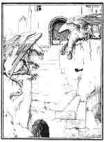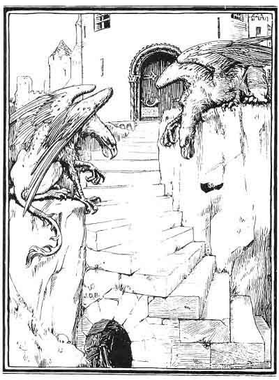 In the morning Jack arose and put on his invisible coat and magic cap and shoes, and prepared himself for the fray. Now, when he had reached the top of the mountain he soon discover4 the two fiery griffins, but passed them without fear, because of his invisible coat. When he had got beyond them, he found upon the gates of the castle a golden trumpet hung by a silver chain, under which these lines were engraved: