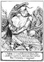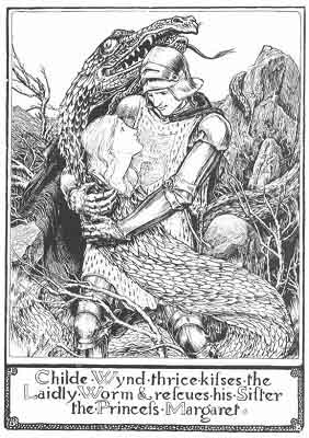 But the moment Childe Wynd had landed, the witch-queen's power over the Laidly Worm had gone, and she went back to her bower all alone, not an imp, nor a man-at-arms to help her, for she knew her hour was come. So when Childe Wynd came rushing up to the Laidly Worm it made no attempt to stop him or hurt him, but just as he was going to raise his sword to slay it, the voice of his own sister Margaret came from its jaws, saying: