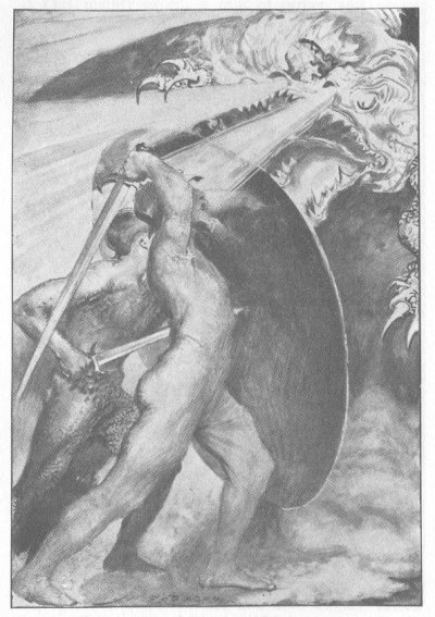 flew, half sprang at Beowulf. But the hero did not retreat one step. His bright sword flashed in the air as he wounded the beast, but not mortally, striking a mighty blow on his scaly head. The guardian of the hoard writhed and was stunned for a moment, and then sprang at Beowulf, sending forth so dense a cloud of flaming breath that the hero stood in a mist of fire. So terrible was the heat that the iron shield glowed red-hot and the ring-mail on the hero's limbs seared him as a furnace, and his breast swelled with the keen pain: so terrible was the fiery cloud that the Geats, seated some distance away, turned and fled, seeking the cool shelter of the neighbouring woods, and left their heroic lord to suffer and die alone.