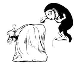 And when the Hobyahs came to their home they hung up the bag with the little girl in it, and every Hobyah knocked on the top of the bag and said, 'Look me! look me!' And then they went to sleep until the next night, for the Hobyahs slept in the daytime.