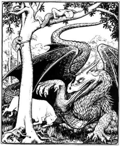 And soon he heard it coming, roaring and raging from afar off, and at last it came near, spitting fire, and with a tongue like a great spear, and you could hear it roaring for miles, and it was making for the place where the king's daughter was staked down. But when it came up to them, the lad just hit it on the head with the bladder and the dragon fell down dead, but before it died, it bit off the little boy's forefinger.