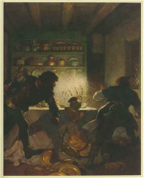 Little John went back to the kitchen and there carefully and silently collected Master Monceux's gold plate. He put it all into a stout sack, tied it up, and waited patiently for dawn.
