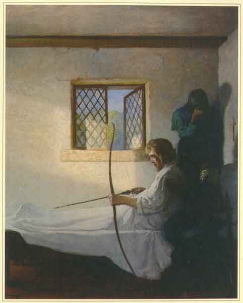 A swift remembrance lit up the dying man's face. "Ah, well," he cried, "Will o' th' Green--you knew! Marian, my heart . . . and that day when first we met, beside the fallen deer! And she is gone, and my last arrow is flown. . . . It is the end, Will--" He fell back into Little John's arms. "Bury me, gossips," he murmured, faintly, "where my arrow hath fallen. There lay a green sod under my head and another beneath my feet, and let my bow be at my side."