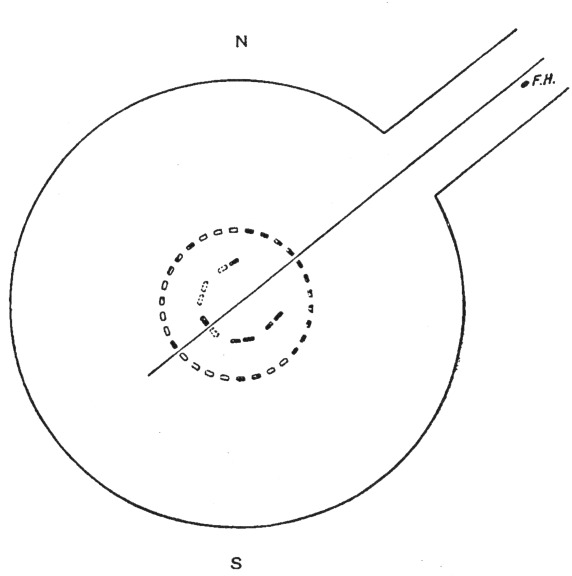 There is also another circle of smaller upright stones, respecting which the only point requiring notice now is that none of them would have interrupted the line of the axis of the avenue. The circular temple was also