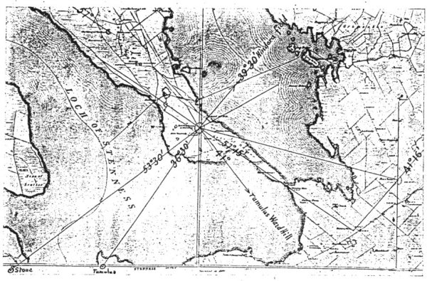 near alignment is on and over the centre of Maeshowe. Colonel Johnston, the Director-General of the Ordnance Survey, has informed me that the true azimuth of this bearing is N. 41° 16´ E., and in all probability it represents the place of sunrise as seen from the Barnstone when Maeshowe was erected. What is most required in Orkney now is that some one with a good 6-inch theodolite should observe the sun's place of rising and the angular height of the hills at the next summer solstice in order to determine the date of the erection of Maeshowe. Mr. Spence and others made an attempt to determine this value with a sextant in 1899, but not from the Barnstone.