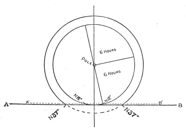 Fig. 61 represents diagrammatically the conditions named, the circumpolar paths of Arcturus and Capella being shown by the smaller and larger circle respectively. A B represents the actual sea horizon and A´ B´ a locally raised horizon 3° high, whilst the dotted portion of the larger circle represents the non--visible part of Capella's apparent path.