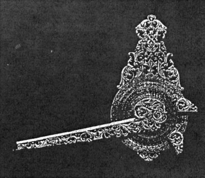 [paragraph continues] There was a disc with a central aperture through which the pole star could be observed; the disc could be adjusted for every night in the year; an arm was then moved round so that the direction of the pointers (or the guards) with regard to the vertical could be measured; on a second concentric circle the time of night could be read off.
