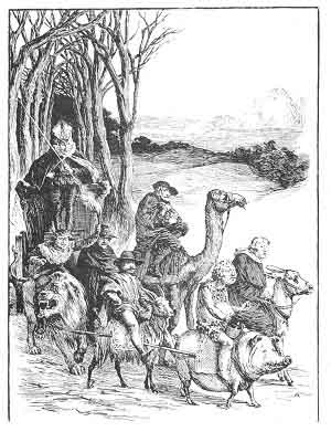 Her coach was adorned with gold and gay garlands, and was one of the most splendid carriages ever seen, but it was drawn by an ugly and ill-matched team. On every animal rode one of her evil Councillors, who was much like in nature to the creature that carried him.